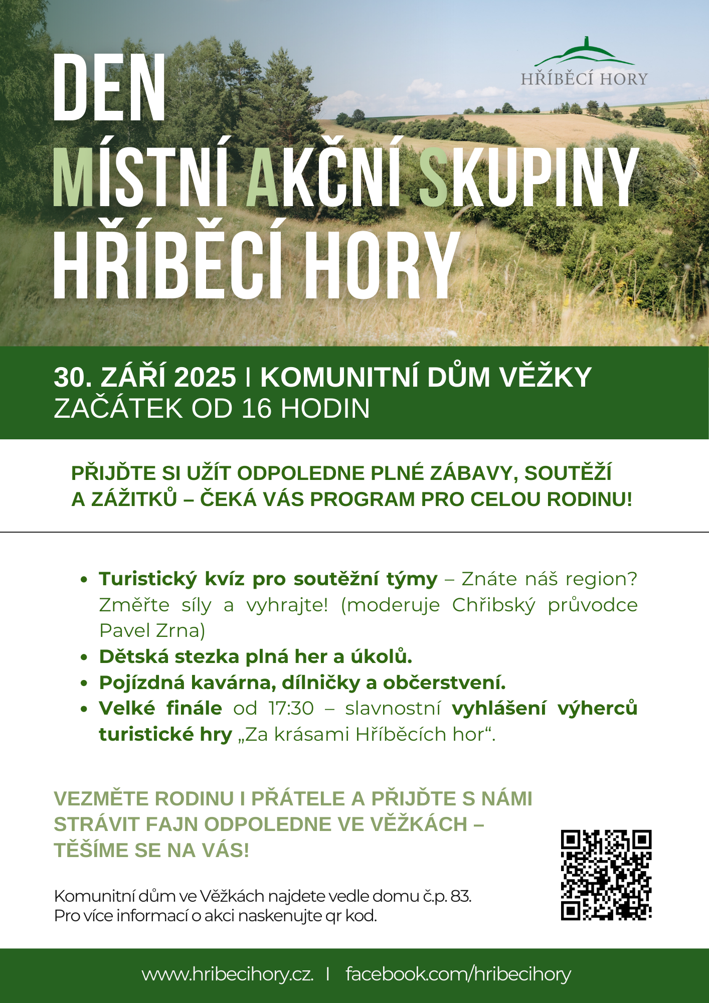 Místní akční skupina Hříběcí hory vás zve na tradiční Den MAS Hříběcí hory, který se letos uskuteční v Komunitním domě ve Věžkách. Akce se koná nepravidelně téměř každý rok a pokaždé má trochu jinou podobu – vloni byla věnována klimatu, letos jsme si pro vás připravili novinky, které propojí zábavu, soutěžení i společné setkávání obcí našeho regionu.